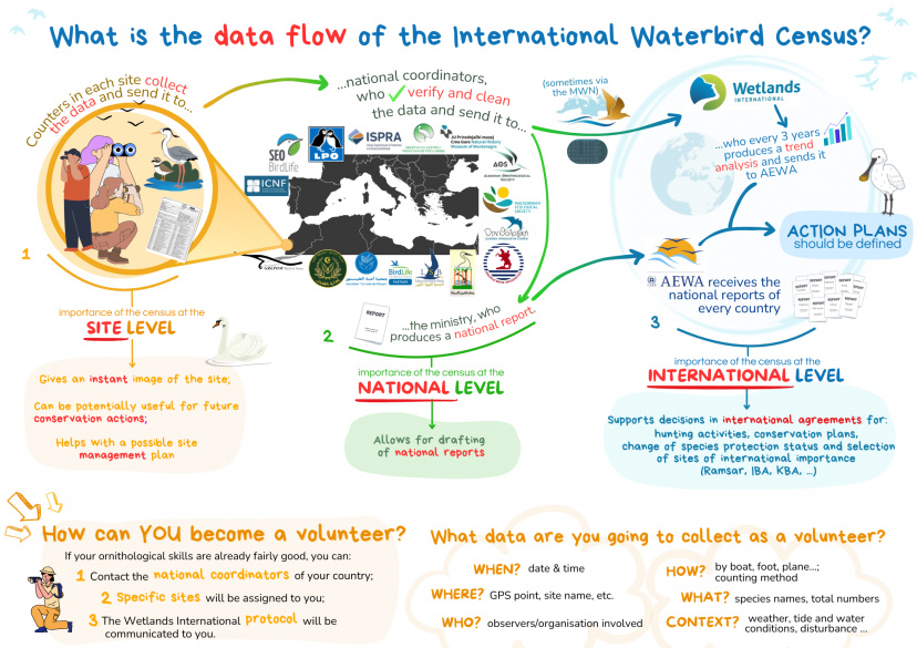 - Provide the necessary information for the management and the protection of waterbird populations through international conventions, national legislation, etc.