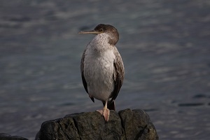 Rather smaller and slimmer than the Great Cormorant, with a more slender neck, smaller more rounded head and finer bill. In flight, differs in the neck being held straighter, and the shorter, more rounded wings. The wingbeats are also slightly faster, with no short glides. Seen mainly at sea.