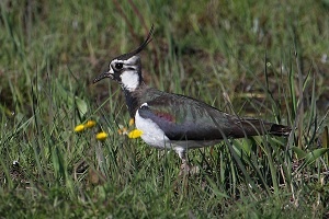 Medium-sized wader, of similar size to a pigeon, with a black, green-glossed back and white belly. The Northern Lapwing has a crest 5 to 7 cm long (shorter in juveniles). It has broad rounded wings producing a distinctive black-and-white pattern. Its flight is strong and flappy due to the slow wingbeats.