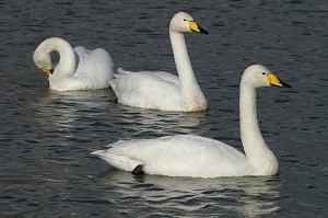 Like the Mute Swan, very large with a long neck. White. Differs from Bewick’s Swan by a long, straight, wedge-shaped bill which is mainly yellow; the yellow extends beyond the nostrils in a point. The tip and upper and lower edges of the bill are black. A faint hissing is produced in flight.