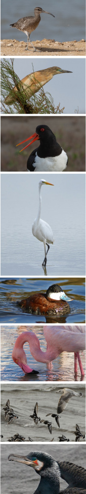 Eurasian Whimbrel (Numenius phaeopus), Squacco Heron (Ardeola ralloides), Eurasian Oystercatcher (Haematopus ostralegus): ©Thomas Blanchon. | Great Egret (Ardea alba): ©Julien Birard. | Ruddy Duck (Oxyura jamaicensis): ©Thomas Galewski | Greater Flamingo (Phoenicopterus roseus): ©Marta Lago | Ruddy Turnstone (Arenaria interpres) with Gull sp.: ©Julien Birard. | Great Cormorant (Phalacrocorax carbo): ©Thomas Galewski.