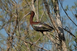 Larger than the Glossy Ibis and more solidly built. Black, short-legged, long tail and curved bill. Plumage black with metallic purple-brown and green gloss. Bill and legs red. Head unfeathered with red skin. Nape feathers elongated and drooping. The juvenile has a dark head, more or less feathered. In flight, the wingbeats are powerful and flexible and Bald Ibis glides in flight. The neck is short and thick and the legs do not extend beyond the tail.